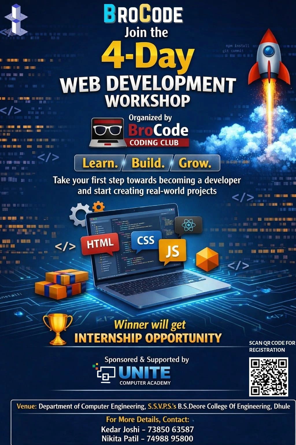 The BroCode Coding Club of the Department of Computer Engineering at S.S.V.P.S.’s B.S. Deore College of Engineering, Dhule, successfully conducted a 4-day Web Development Workshop from March 30 to April 2, 2026. The workshop aimed to equip students with essential technical skills and hands-on experience in modern web technologies.