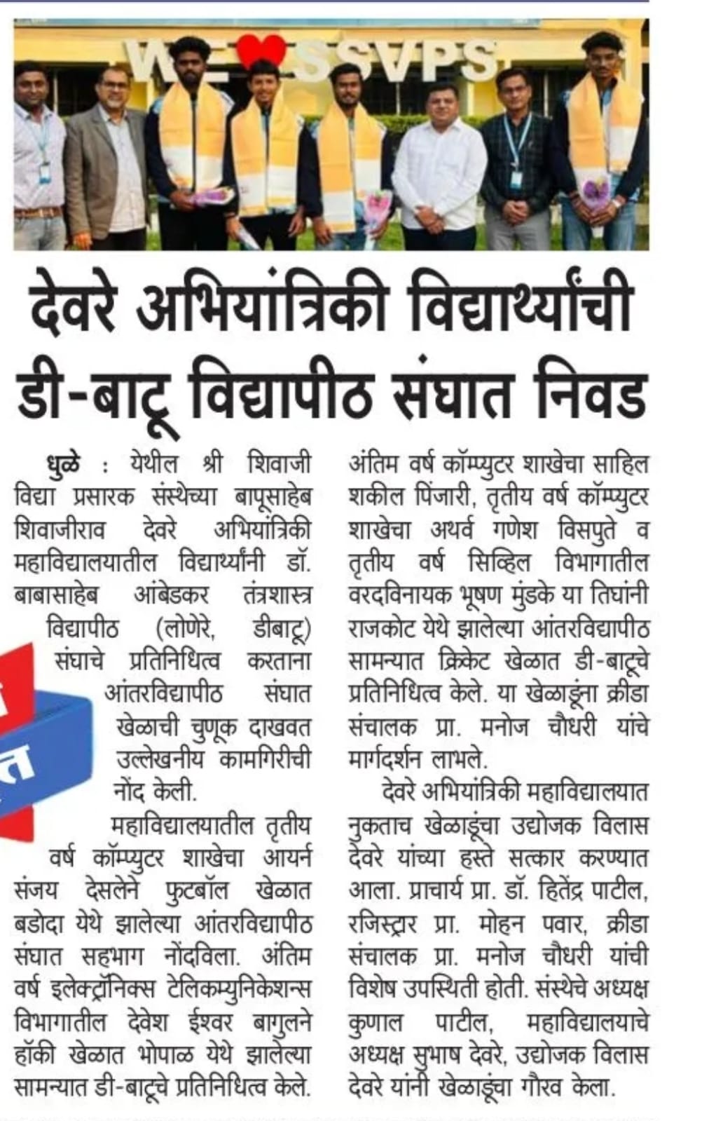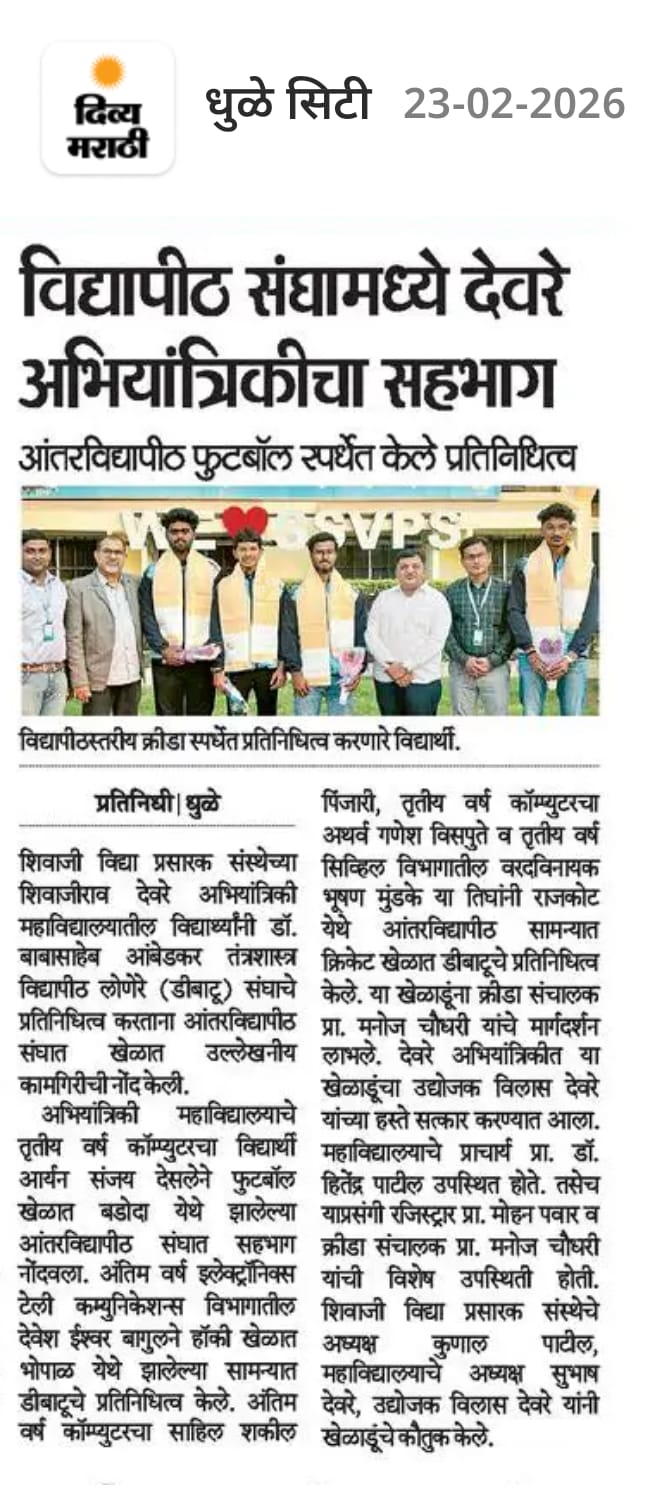Over 100 participants that hailed from different regions and universities of the state took part in the sports meet, two students from our college participated in this event and one student; Mr. Devesh Ishwar Bagul of BTech (E&TC) is selected to perform at the National Inter- University games scheduled to be held at Bhopal (MP).