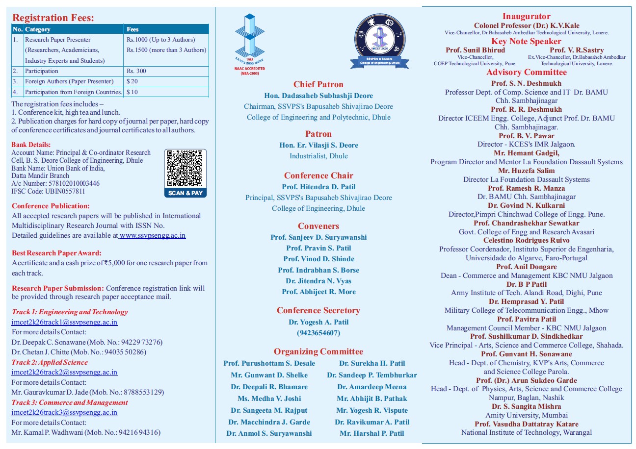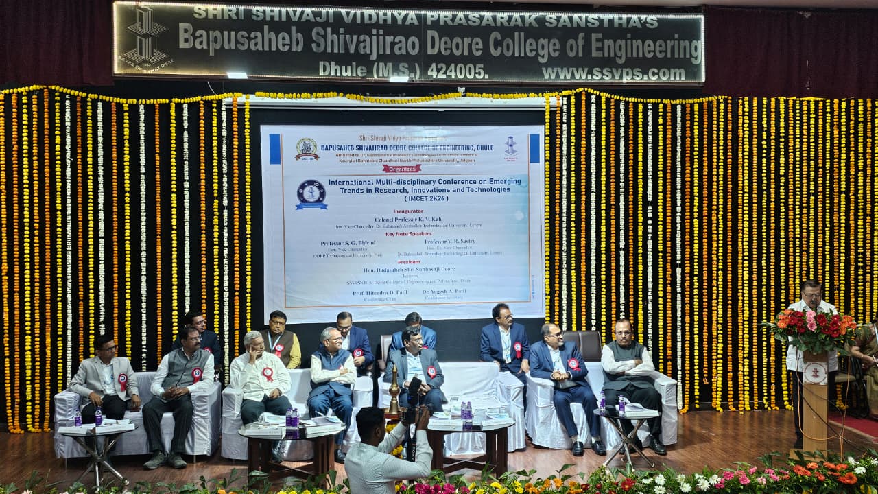 The International Multidisciplinary Conference on Emerging Trends in Research, Innovations and Technologies (IMCET 2K26) was successfully organized on March 14, 2026, at SSVPS's Bapusaheb Shivajirao Deore College of Engineering in Dhule. Bringing together academicians, researchers, industry experts, and students from across the country, the conference provided an eminent platform for exchanging innovative ideas, discussing recent research advancements, and fostering collaboration across multiple disciplines.