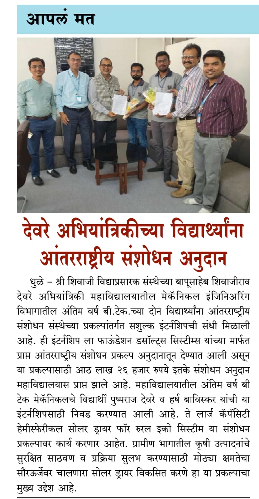 B.Tech students Pushparaj Deore and Harsh Baviskar from the Mechanical Engineering Department of SSVPS BSD College of Engineering have achieved a remarkable milestone by securing a prestigious research grant of ₹8,23,000 from the International Project Research Fund of Dassault Systèmes. This recognition not only highlights the technical abilities and innovative mindset of the students but also brings pride to the institution and its Mechanical Engineering Department.