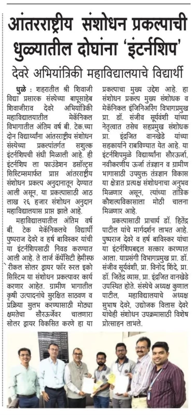 This achievement demonstrates the growing research culture at SSVPS BSD College of Engineering and reflects the institution’s commitment to encouraging students to engage in innovative and socially relevant projects. It also highlights the importance of industry-academic collaboration in nurturing young engineers and supporting projects that can have a meaningful impact on society.