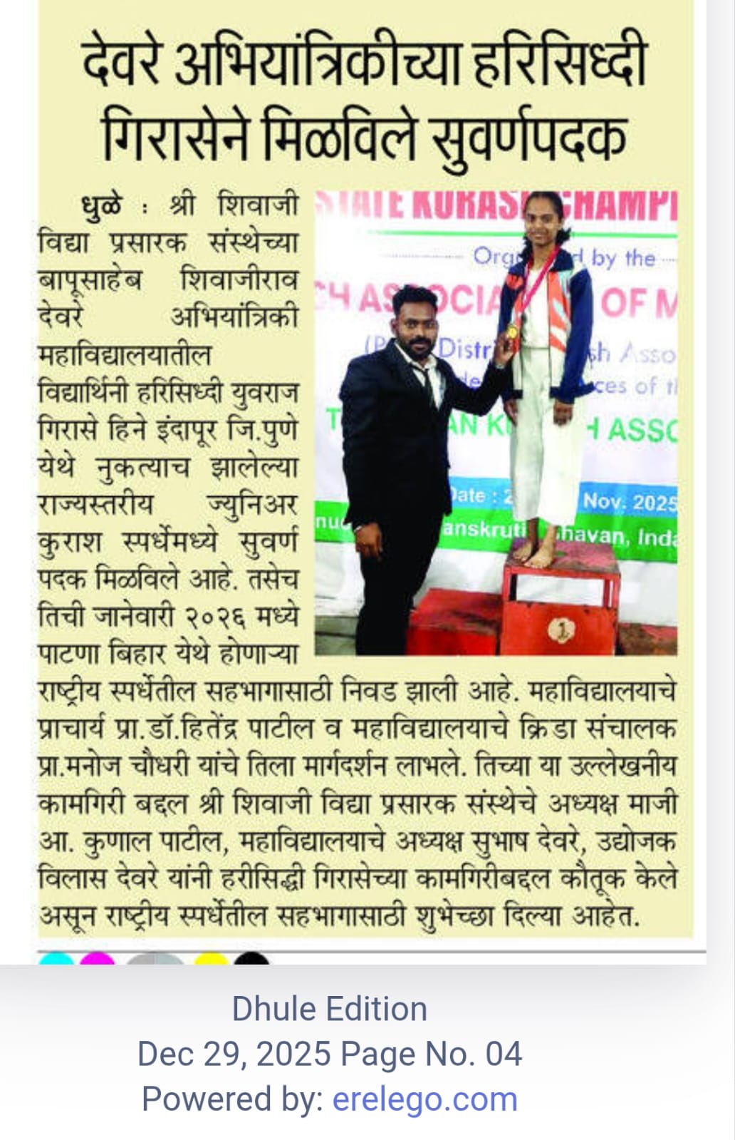 It is an utmost proud moment for our college that in the recently held state level sports event held at Indapur in Pune District, our student Ms. Harisiddhi Girase of Department of Applied Science admitted to the Civil Engineering stream, performed exceptionally well winning the Gold Medal in the marshal sport of Kurash. She has further secured the position to perform at the National Level sports meet scheduled to be held in January 2026 at Patna, Bihar.