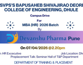 Departmental Activities of Management Studies: MBA HR Placement Update Dt. 15 April '26 MBA (HR) Placement Drive April '26 Blood Donation and Free Health Check-up Program Felicitation of our Alumni Lt. Saloni Borse IMCET 2K26: A Landmark Multidisciplinary Conference at B. S. Deore College of Engineering, Dhule, March 14, 2026: Trump, Tariff and Trade Wars - A Talk Show Sula Wines Industrial Visit One Day Faculty Development Program University Level Research Convention (Phase-I and II) - Avishkar 2025 Students Appreciation Program 24 & 25 May 2025.. Students Appreciation Program 24 & 25 May 2025 Technofest 2K25 (Crane-Brain) Technofest 2K25 ( Buoyancy Force) Industrial Visit Induction Program Workshop on Guest Seminar/Lecture/Workshop Entrepreneurship Development Program Spandan (Annual Gathering) Poster Presentation Alumni Association