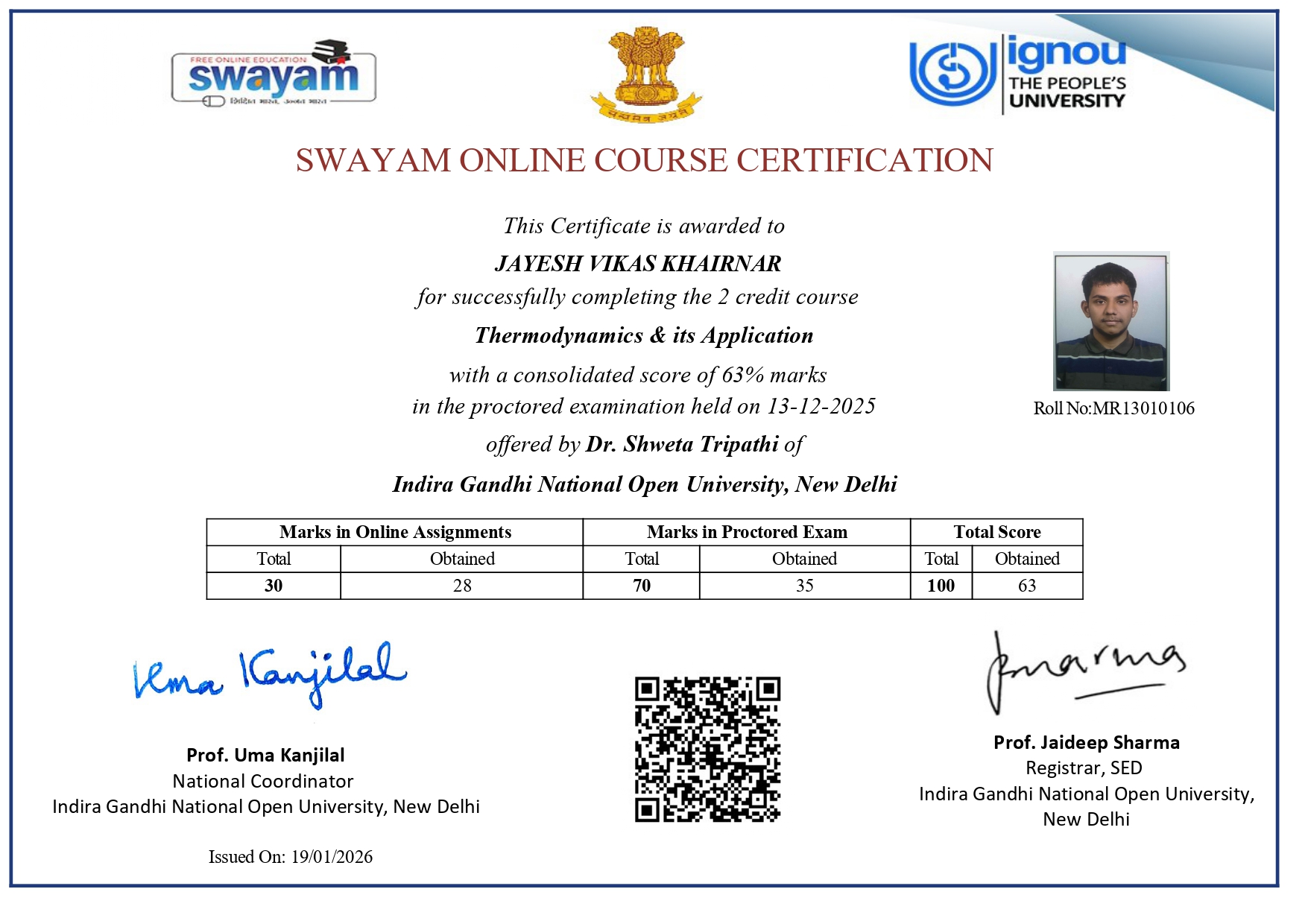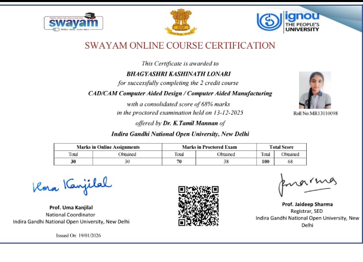 Departmental Student Achievements of Mechanical Engineering: JAYESH VIKAS KHAIRNAR SWAYAM CERTIFICATE BHAGYASHRI KASHINATH LONARI SWAYAM CERTIFICATE Sanket Jagdish Deore NPTEL CERTIFICATION Venkatesh Narayan Sharma NPTEL CERTIFICATION Vipul Bhamre AutoCAD Essentilas Hitesh Shinde AutoCAD Essentials Darshan Bedse AutoCAD Essentials